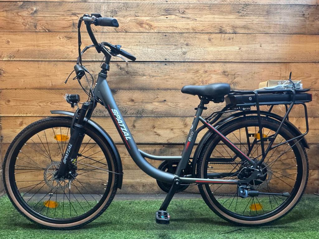 Spatial ECO er en ny elcykel med et stel på 53 cm og 26" hjul, der er ideel til komfortabel og pålidelig daglig brug. Det stærke 36V 13Ah (468Wh) batteri og baghjulsmotoren giver jævn støtte, mens de 3 gear, håndbremserne og de fungerende for- og baglygter sikrer en sikker og behagelig tur. Med sin lave indstigning, højdejusterbare sadel og styr, sidestøtte og robuste bagagebærer er denne elcykel perfekt til både korte og længere ture. Cyklen har et moderne look i mat grå og er fuldt trafiksikker.
